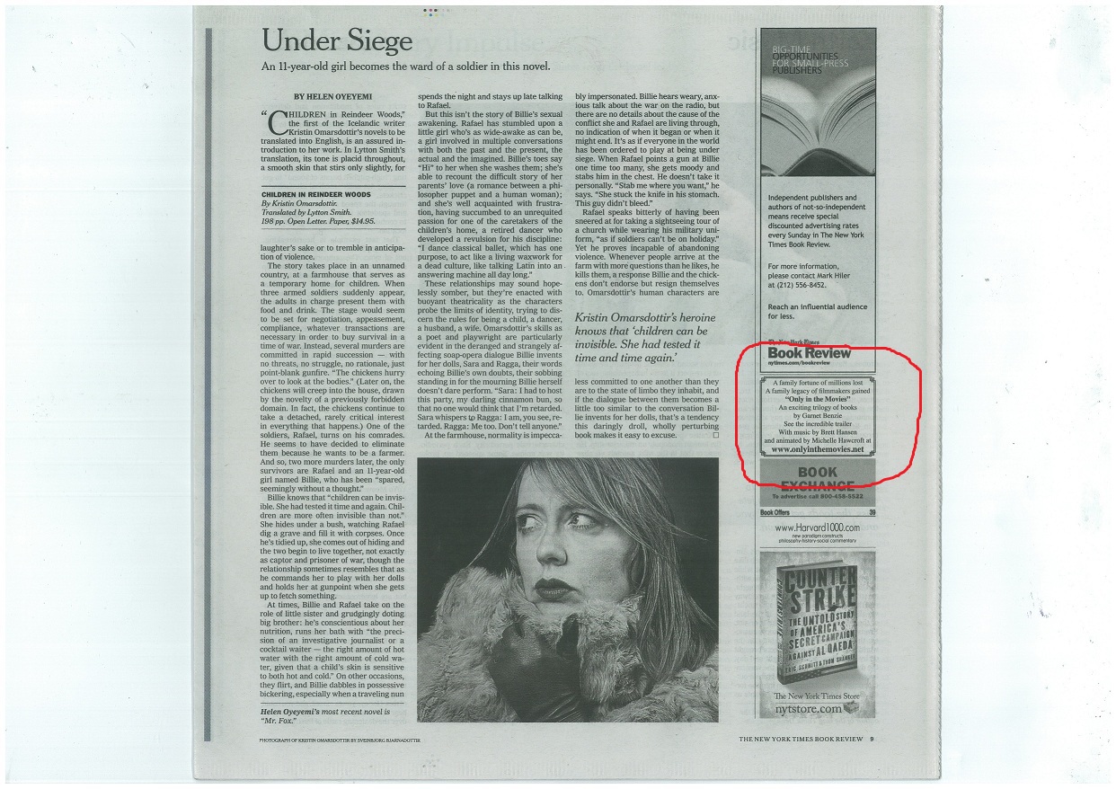 This is the bottom half of the page where the ad appeared in the Los Angeles Times.  Continue to scroll down to see the New York Times ad.
