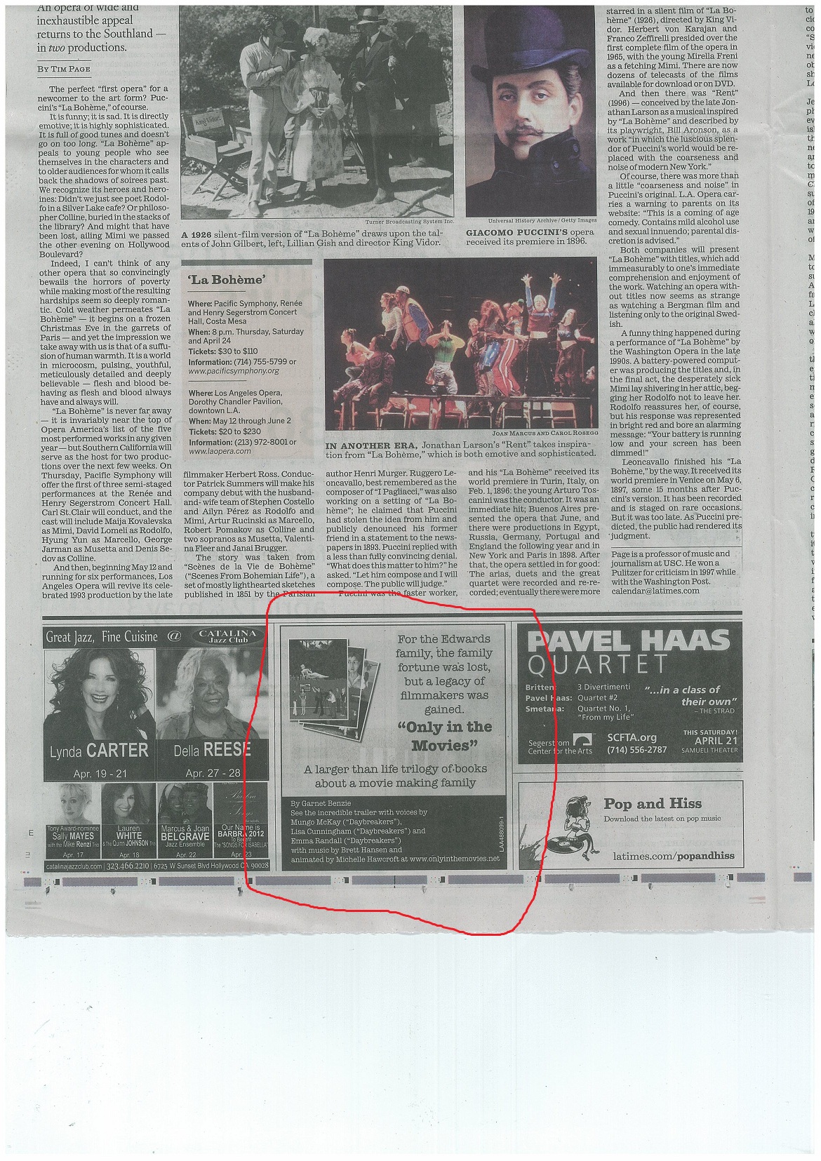 On the fifteenth of April 2012 I advertised in both the New York Times and the Los Angeles Times.  To see the best ad more clearly click here.  To see what the how it appeared in both the New York Times and the Los Angeles Times continue to scroll down below.  This is the top half of the page where the Los Angeles ad appeared which was obviously page six.  The ad itself appears on the bottom half of the page.